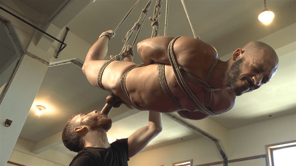 Official Synopsis: Abel Archer is a hot bisexual stud coming to us completely fresh to bondage and edging. We start him off in the center of the room tied to each column. We get him hard through his underwear before cutting them off to reveal his fat cock. With his hands bound hes made to watch as we tease him with our fingertips. While sucking on the head of his cock we blindfold him and bring him to the edge of cumming again and again. Hes bent over and the dildo up his ass makes precum ooze out of his cock. Fully suspended, and raging hard, we bring him to the edge again as Abel begs to cum in Sebastians mouth. Tied to a bean bag we fuck his ass some more and finally allow him to shoot his load all over himself. He moans and begs for us to stop jerking his sensative cock after his orgasm so we tickle him in the tight bondage instead.
