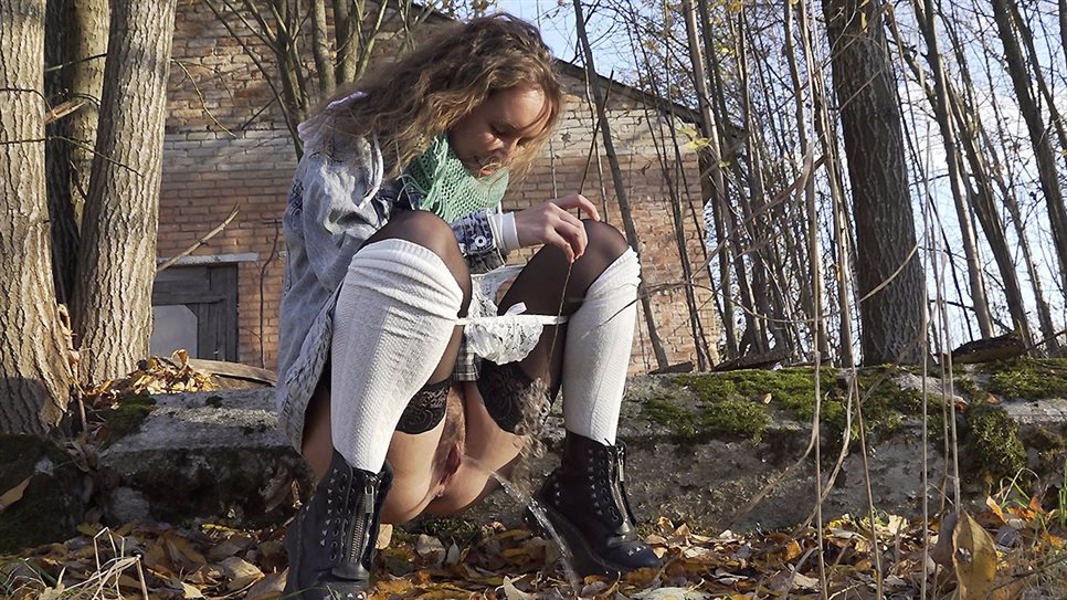Official Synopsis: A brunette European walks past run down buildings and lifts up her flowy skirt so that she can relieve her pee desperation. She lifts one leg up and while showing off her lace topped stockings, enjoys a pee standing while we film her and zoom in on her hairy pussy for .