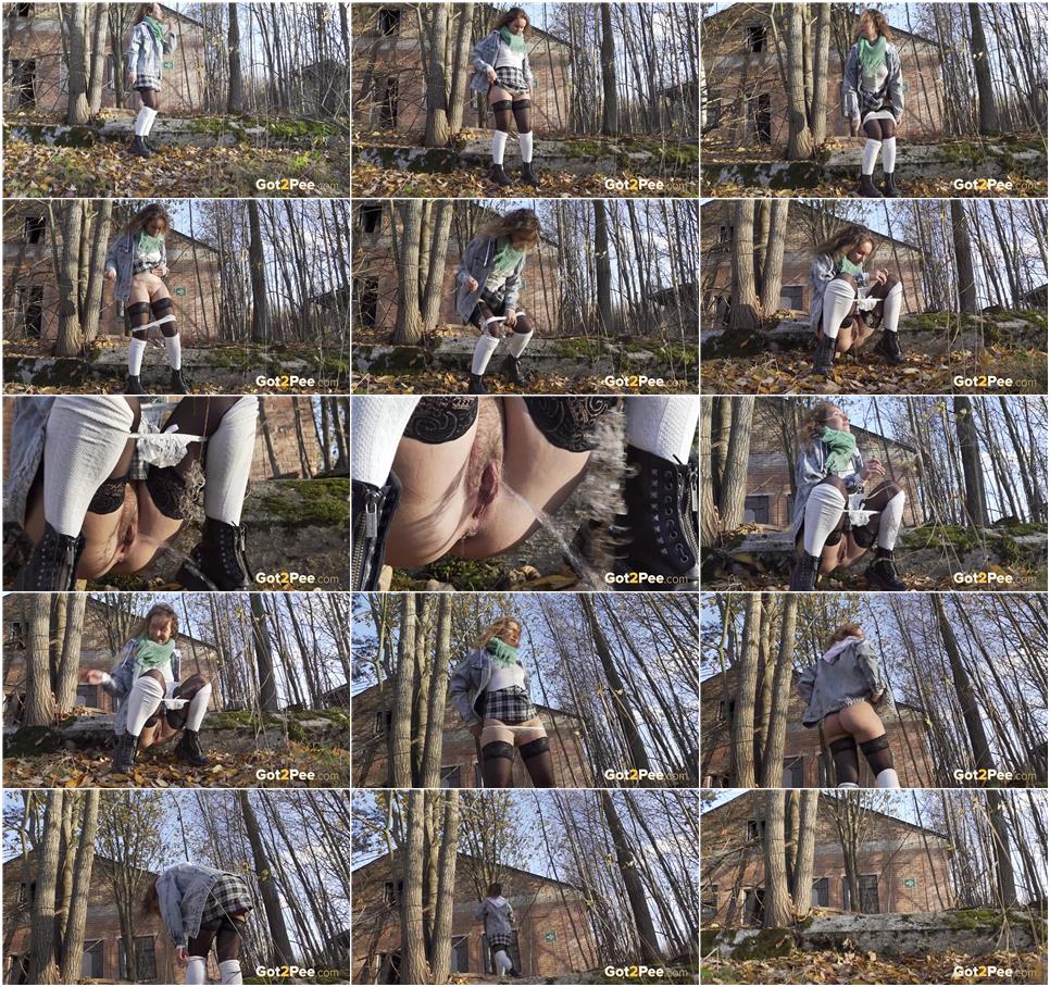 Official Synopsis: Join us for our latest pissing porn movie here on as a cute brunette walks in stockings and socks, teamed with a plaid miniskirt! She pulls down her white panties and squatting to pee, leans back on a piece of wood before pissing all over the ground with her hairy pussy on show!