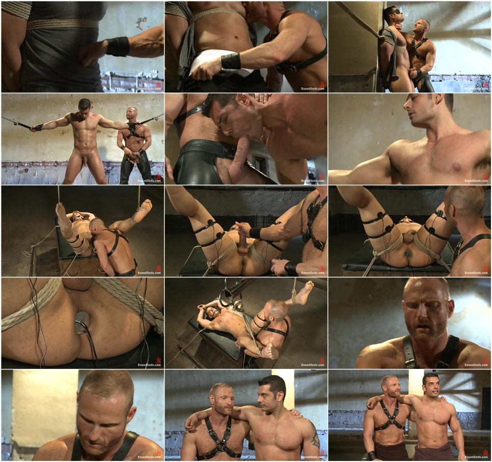 Official Synopsis: Colby Jansen finds himself tied up tight in the dungeon of Trent Diesel. Trent wastes no time ripping his clothes off and beating him. He then feeds him his cock and clamps Colbys nipples to the floor. Trent gets over-confident in his bondage, however, and Colby is able to break free while being flogged. With Trent tied up Colby gets in a revenge flog before stretching him out and arching him off the stock table by his balls. Colby throws Trent on the ground and fucks a load out of the exhausted former Dom.