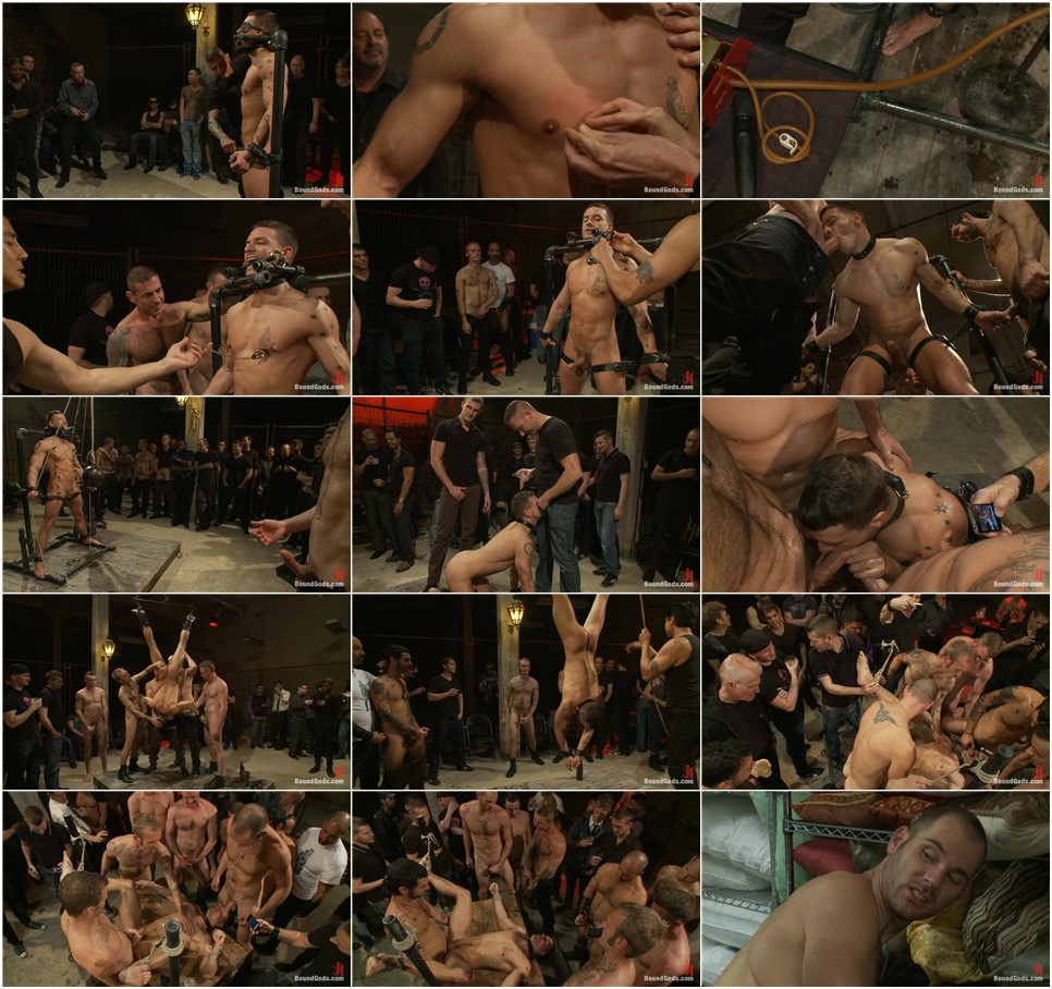 Official Synopsis: Super stud Adam Knox is tied up to the metal rack for the horny crowd to use. Adam is helpless with metal bondage around his neck as the public gropes and strips him naked. Christian Wilde gets his cock hard when he flogs the hell out of Adam in front of everyone. He and Cole Streets suspend Adam upside down and the crowd spits and throws drinks at the poor guy. Everyone crowds around Adam for a good old fashioned gang bang. Adam receives load after load of hot cum.