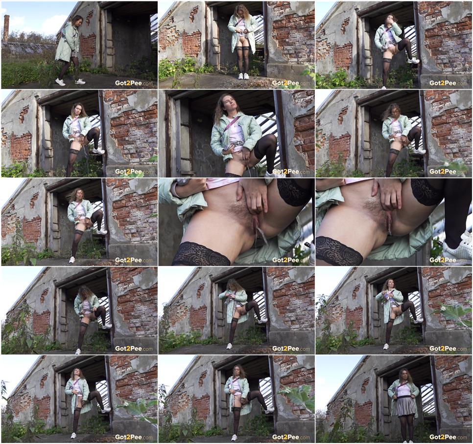 Official Synopsis: A brunette European walks past run down buildings and lifts up her flowy skirt so that she can relieve her pee desperation. She lifts one leg up and while showing off her lace topped stockings, enjoys a pee standing while we film her and zoom in on her hairy pussy for .