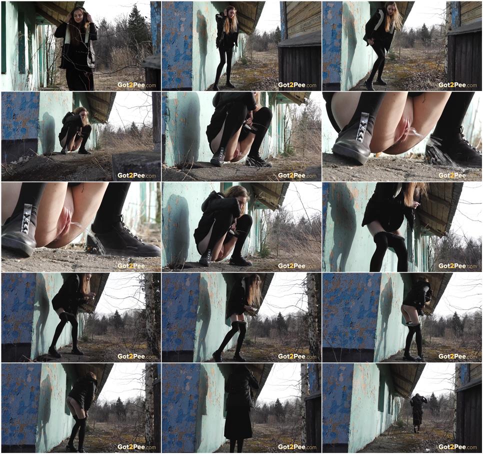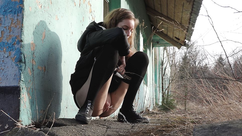 Official Synopsis: Our latest public pissing scene features a hot brunette who is walking outside in the sun. She finds an old wooden building and lifts one leg up onto a ledge before enjoying a pee standing with her panties pulled to one side. She shakes from side to side as we zoom in on her messy stream!