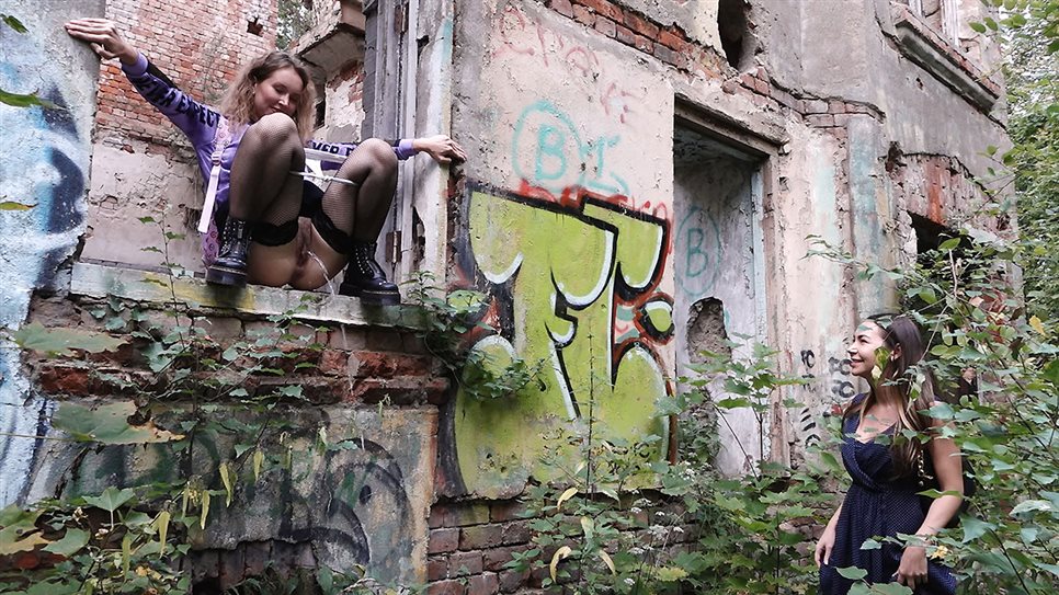 Official Synopsis: Two best friends are walking down a woodland track in the suburbs when they spot an old abandoned building. One of the friends climbs into a window frame and hikes up her skirt, showing off her lace topped stockings. She pulls down her panties and starts public peeing over the ground, while her friend looks for some tissues in her handbag. That's what friends are for and we capture the whole thing for !